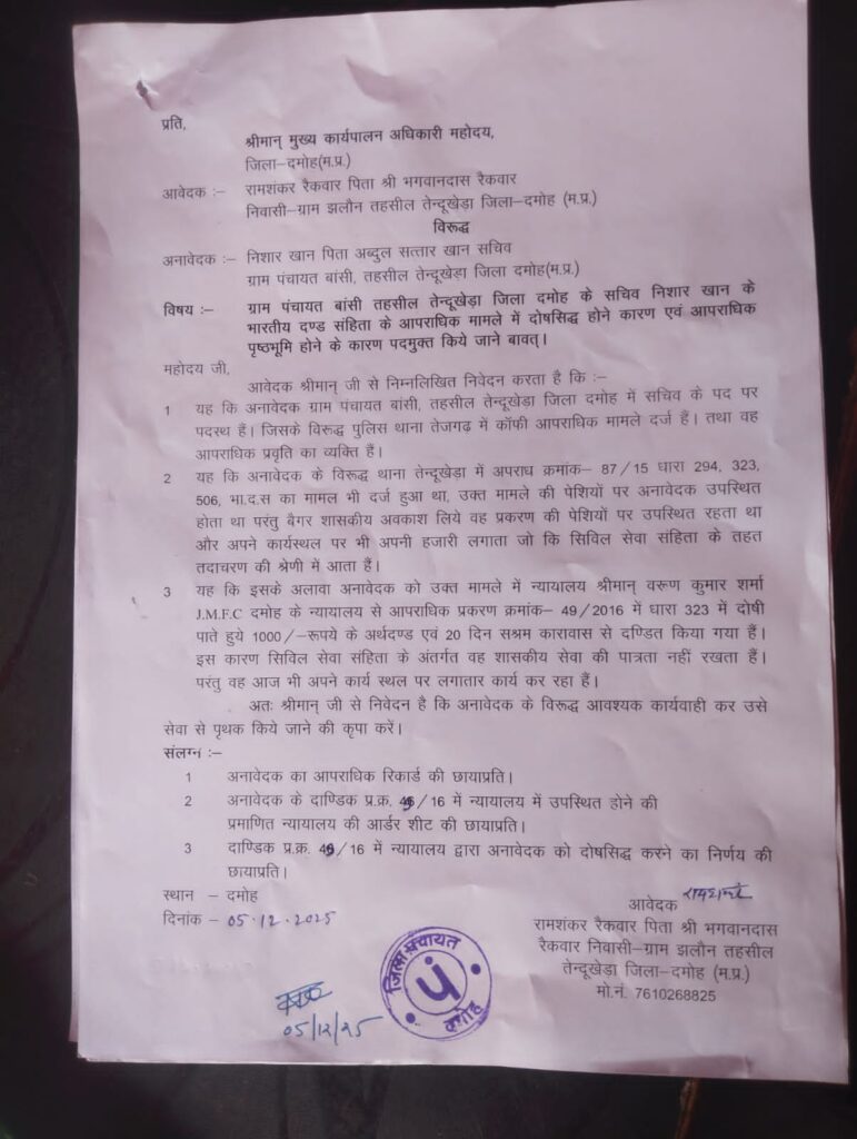 ग्राम पंचायत बांसी तहसील तेन्दूखेड़ा जिला दमोह के सचिव निशार खान पिता अब्दुल सत्तार खान भारतीय दण्ड संहिता के आपराधिक मामलों में दोष सिद्ध पाए गए है,एवम उनका आपराधिक रिकार्ड को देखते हुए मेने उनको पद मुक्त करने हेतु शासन को आवेदन किया है।राम शंकर ने बताया है कि