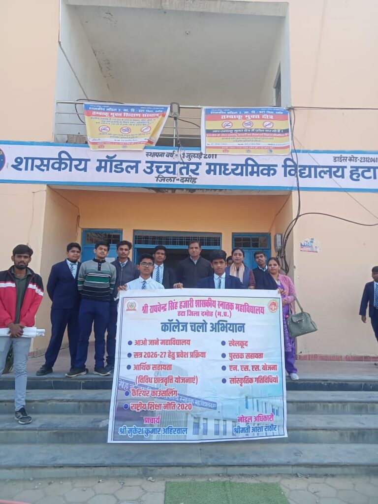 श्री राघवेंद्र सिंह हजारी शासकीय महाविद्यालय हटा द्वारा ‘कॉलेज चलो अभियान’ के अंतर्गत हटा क्षेत्रातर्गत आने वाले उच्चतर माध्यमिक विद्यालयों का भ्रमण कर कक्षा 12वीं के विद्यार्थियों को विधिक जानकारी प्रदान की जा रही है। कॉलेज चलो अभियान की नोडल अधिकारी आशा राठौर एवं महाविद्यालय के अन्य अधिकारियों द्वारा शासकीय महारानी लक्ष्मीबाई उच्चतर माध्यमिक कन्या विद्यालय हटा, शासकीय नवीन उच्चतर माध्यमिक विद्यालय हटा, शासकीय सांदीपनि उत्कृष्ट उच्चतर माध्यमिक विद्यालय हटा, शासकीय मॉडल उच्चतर माध्यमिक विद्यालय हटा का भ्रमण कर कक्षा 12वीं के विद्यार्थियों को महाविद्यालय की सहायक प्राध्यापक आशा राठौर, डॉ. राहुल चौधरी, ममता सोनी, डॉ. ज्योति सेन एवं अन्य महाविद्यालयीन अधिकारियों द्वारा महाविद्यालय की ई-प्रवेश प्रक्रिया, राष्ट्रीय शिक्षा नीति-2020, विविध छात्रवृत्ति योजनाओं, करियर मार्गदर्शन, खेलकूद गतिविधियों, राष्ट्रीय सेवा योजना, सांस्कृतिक गतिविधियों, कौशल आधारित पाठ्यक्रमों, स्वयं पोर्टल के माध्यम से अध्ययन आदि विविध सुविधाओं के बारे महत्त्वपूर्ण जानकारी प्रदान की गई।