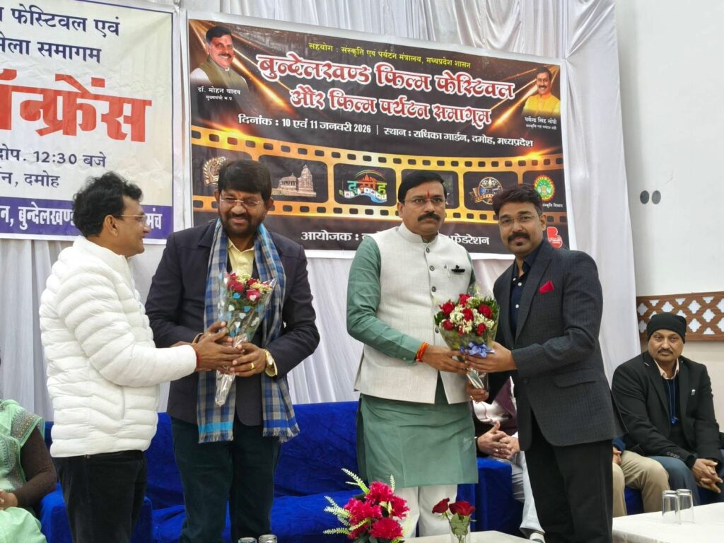 मध्यप्रदेश शासन की फिल्म पर्यटन नीति-2025 के प्रभावी क्रियान्वयन तथा बुन्देलखण्ड क्षेत्र की कला, लोक संस्कृति, भाषा एवं सांस्कृतिक धरोहर को राष्ट्रीय एवं अंर्तराष्ट्रीय मंच पर स्थापित करने की दिशा में “बुन्देलखण्ड फिल्म फेस्टिवल एवं फिल्म पर्यटन समागम” एक अत्यंत महत्वपूर्ण एवं दूरदर्शी पहल है। इस आशय के विचार प्रदेश के संस्कृति, पर्यटन, धार्मिक न्यास एवं धर्मस्व राज्यमंत्री धर्मेन्द्र सिंह लोधी ने आज मीडियाजनों के समक्ष व्यक्त किये। इस अवसर पर राज्यमंत्री द्वय और अतिथियों ने “बुन्देलखण्ड फिल्म फेस्टिवल एवं फिल्म पर्यटन समागम” पोस्टर का विमोचन किया। कार्यक्रम में पशुपालन एवं डेयरी विभाग के राज्यमंत्री लखन पटैल, जिला पंचायत अध्यक्ष रंजीता गौरव पटैल, भाजपा जिलाध्यक्ष श्याम शिवहरे, पूर्व भाजपा अध्यक्ष नरेन्द्र व्यास, प्रोफेसर रश्मि जेता, सत्येन्द्र सिंह लोधी, एसडीएम आरएल बागरी, राजीव अयाची मंचासीन थे।