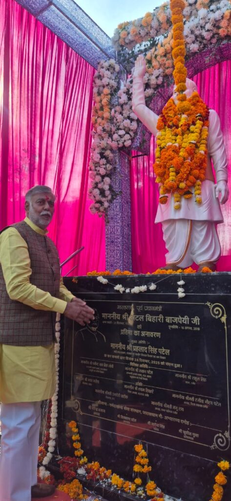 को श्रद्धेय अटल जी शताब्दी वर्ष का समापन है, 101 वीं जयंती है, इसलिए अटल जी जयंती के अवसर पर उनको चरणो में श्रद्धांजलि अर्पित करता हूं, यह उनकी और अन्य लोगों की इच्छा थी कि यहाँ बेलाताल के समक्ष अटल जी की प्रतिमा लगे। उन्होंने नर्मदा खंड सेवा संस्थान का आभार व्यक्त किया जिसने इस इच्छा को पूरा किया, मूर्ति बनवाई और वह यहां लगी। अटल जी ने वो आयाम तय किए, दुनिया की राजनीति में सरकार का नेतृत्व, प्रतिनिधि मंडल का नेतृत्व यूएन (UN) में कोई विपक्ष का नेता करे, उस व्यक्ति का नाम अटल बिहारी वाजपेयी है। इस आशय के विचार प्रदेश के पंचायत एवं ग्रामीण विकास, श्रम मंत्री प्रहलाद पटेल ने आज स्थानीय बेलाताल ऑडिटोरिम के समीप पूर्व प्रधानमंत्री श्रद्धेय श्री अटल बिहारी बाजपेयी जी की प्रतिमा का अनावरण करते हुये व्यक्त किये। इस अवसर पर 36.62 करोड़ के 105 निर्माण कार्यों का भूमिपूजन हुआ । पंचायत मंत्री प्रहलाद सिंह पटेल नेअटल बिहारी वाजपेयी जी की प्रतिमा के अनावरण पर खुशी व्यक्त की।