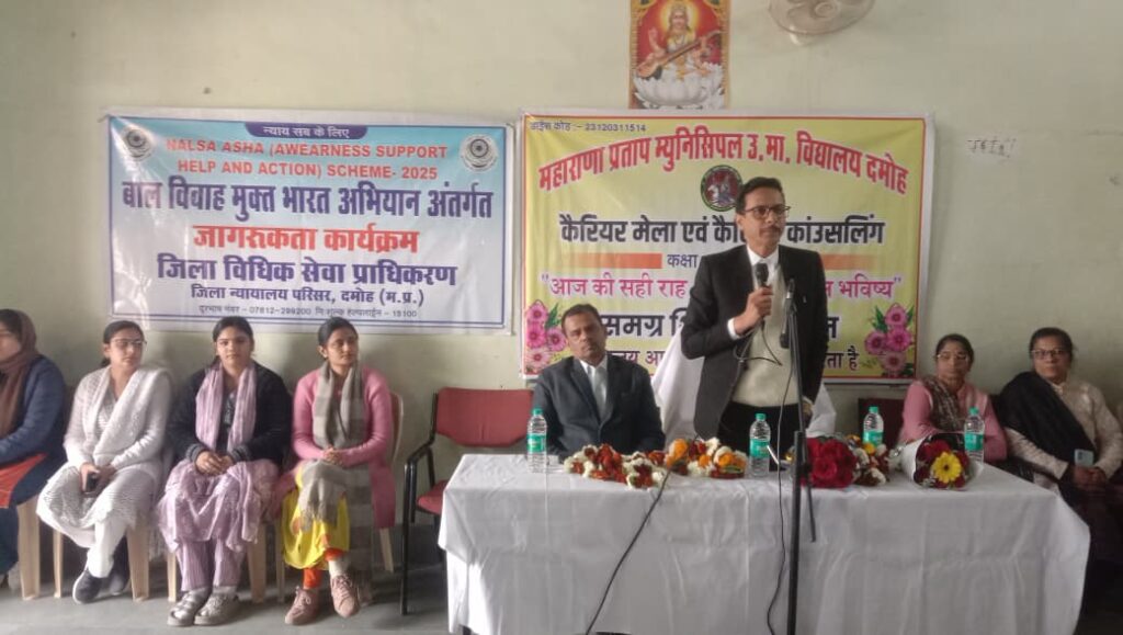 राष्ट्रीय विधिक सेवा प्राधिकरण नई दिल्ली के तत्वाधान में एवं म.प्र. राज्य विधिक सेवा प्राधिकरण जबलपुर के निर्देशानुसार एवं प्रिंसिपल जिला न्यायाधीश/अध्यक्ष सुभाष सोलंकी जिला विधिक सेवा प्राधिकरण दमोह के मार्गदर्शन में शासकीय महाराणा प्रताप उच्चतर माध्यमिक विद्यालय दमोह में विधिक जागरूकता कार्यक्रम का आयोजन किया गया। कार्यक्रम में जिला न्यायाधीश धर्मेश भट्ट, जिला विधिक सहायता अधिकारी रजनीश चौरसिया, प्राचार्य जितेन्द्र कुमार राय सहित समस्त शिक्षकगण तथा छात्रगण उपस्थित रहे।