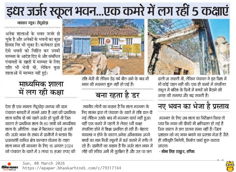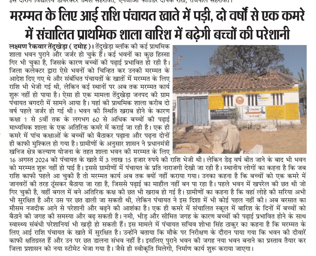 ऐसा ही एक मामला तेंदुखेड़ा जनपद की ग्राम पंचायत बगदरी में सामने आया है। यहां की प्राथमिक शाला करीब दो वर्ष पहले जर्जर हो गई थी। भवन की स्थिति खराब होने के कारण कक्षा 1 से 5वीं तक के लगभग 60 से अधिक बच्चों की पढ़ाई माध्यमिक शाला के एक अतिरिक्त कमरे में कराई जा रही है। एक ही कमरे में पांच कक्षाओं के बच्चों को बैठाकर पढ़ाना और पढ़ना दोनों ही काफी मुश्किल हो गया है।