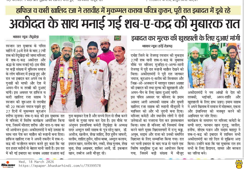 तेंदूखेड़ा। रमजान उल मुबारक के पवित्र महीने में 26वें रोज़े के बाद 27वीं शब को तेंदूखेड़ा की जामा मस्जिद में शब-ए-कद्र अकीदत और श्रद्धा के साथ मनाई गई। इस मौके पर बड़ी संख्या में मुस्लिम समाज के लोग मस्जिद में इकट्ठा हुए और रात भर इबादत कर अपने रब से गुनाहों की माफी और देश में अमन-चैन व तरक्की की दुआएं मांगी।