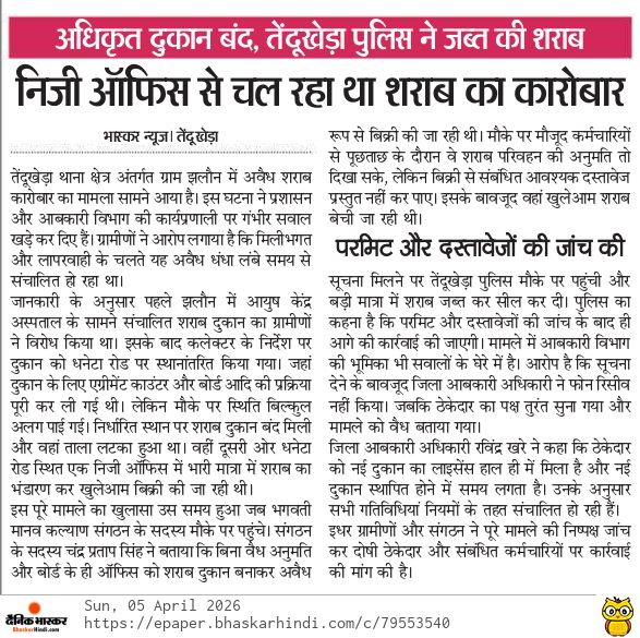 सूचना मिलने पर तेंदूखेड़ा पुलिस मौके पर पहुंची और बड़ी मात्रा में शराब जब्त कर सील कर दी। पुलिस का कहना है कि परमिट और दस्तावेजों की जांच के बाद ही आगे की कार्रवाई की जाएगी।