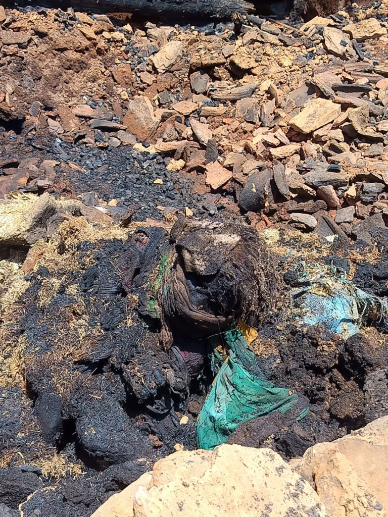 सूत्रों और ग्रामीणों के अनुसार, मृतका अपने बेटे के साथ घर में रहती थी। ग्रामीणों का आरोप है कि महिला के बेटे ने ही घर में आग लगाकर उसे जिंदा जला दिया। कुछ लोगों का यह भी दावा है कि महिला के हाथ कटे हुए थे और मुंह तार से बंधा हुआ था, जिसके बाद आग लगाई गई।