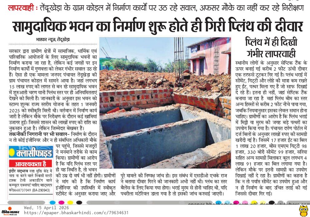 सरकार द्वारा ग्रामीण क्षेत्रों में सामाजिक, धार्मिक एवं पारिवारिक आयोजनों के लिए सामुदायिक भवनों का निर्माण कराया जा रहा है, लेकिन कई जगहों पर इन निर्माण कार्यों में गुणवत्ता को लेकर गंभीर सवाल उठ रहे हैं। ऐसा ही एक मामला जनपद पंचायत तेंदुखेड़ा की ग्राम पंचायत कोडल में सामने आया है, जहां लगभग 15 लाख रुपये की लागत से बन रहे सामुदायिक भवन में शुरुआती चरण यानी प्लिंथ स्तर पर ही अनियमितताएं देखने को मिली हैं।