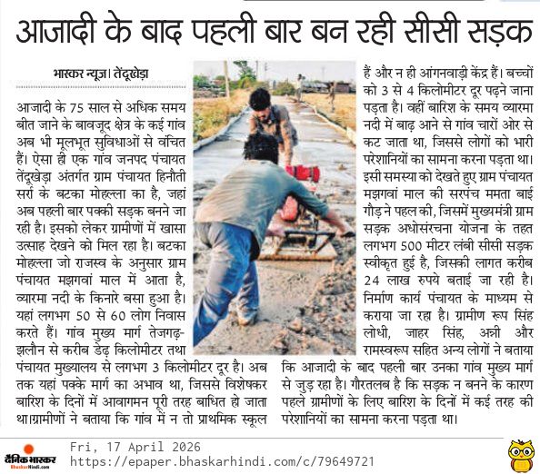 आजादी के 75 वर्षों से अधिक समय बीत जाने के बावजूद क्षेत्र के कई गांव अब भी मूलभूत सुविधाओं से वंचित हैं। ऐसा ही एक गांव जनपद पंचायत तेंदूखेड़ा अंतर्गत ग्राम पंचायत हिनौती सर्रा के बटका मोहल्ला का है, जहां अब पहली बार पक्की सड़क बनने जा रही है। इसको लेकर ग्रामीणों में खासा उत्साह देखने को मिल रहा है।