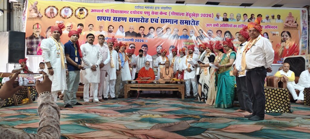 नगर स्थित आचार्य विद्यासागर दयोदय पशु सेवा केन्द्र में हाल ही में संपन्न हुए निर्वाचन के बाद नवनिर्वाचित कार्यकारिणी का शपथ ग्रहण समारोह गुरुवार को संतों के सानिध्य में भव्य रूप से आयोजित किया गया। कार्यक्रम में धार्मिक, सामाजिक और जनप्रतिनिधि क्षेत्र की अनेक प्रमुख हस्तियों की गरिमामयी उपस्थिति रही।